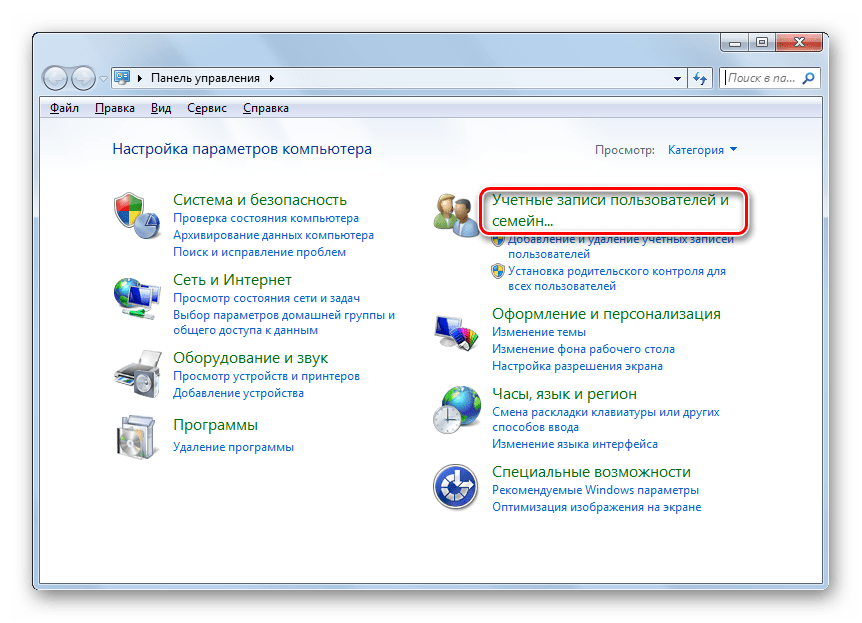 Это самый распространенный метод блокировки ПК. Для начала, войдем в панель управления через кнопочку «Пуск» (в Windows 8 нажимаем горячие клавиши Win + X). Войдя в панель управления, вверху справа выбираем «Категория». Далее, выберем «Добавление и удаление учетных записей».