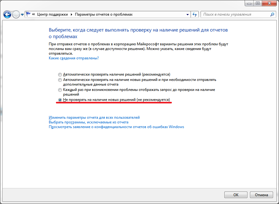 Первым делом нажмите на стрелочку (см. скриншот) в разделе Обслуживание. Это откроет ранее скрытые пункты, и вы сможете добраться до параметров. Выберите там пункт «Не проверять на наличие новых решений».