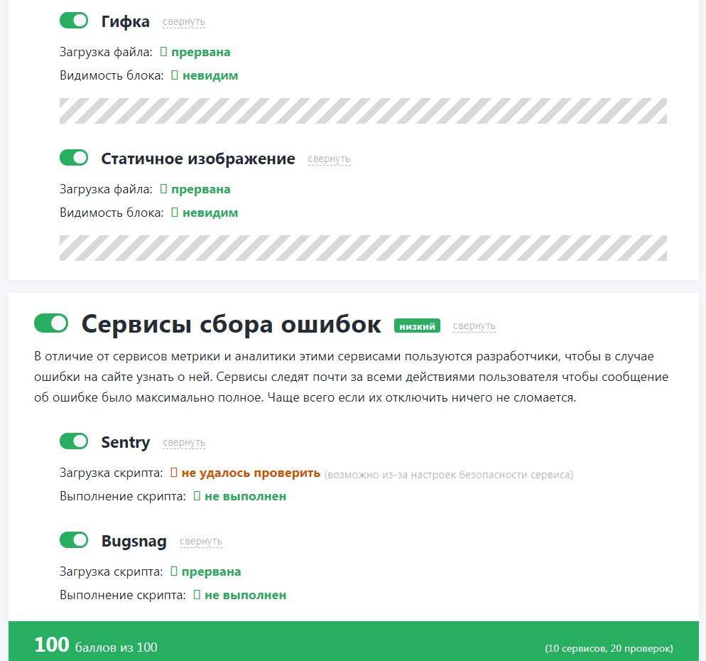Без блокировщика получилось 47 баллов из 100. Пролезло много рекламы, скрипты аналитики отработали
