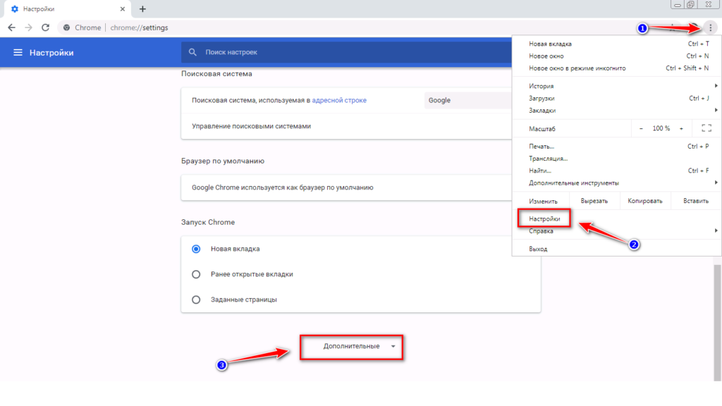 - Открыть настройки Chrome, нажав по кнопке в виде 3 точек в верхнем правом углу браузера, а затем – «настройки» в появившемся списке.
