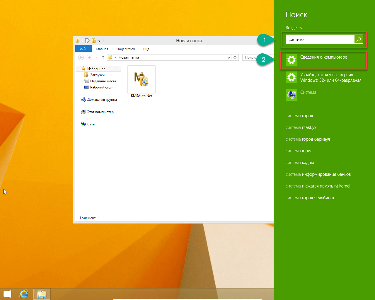 - Давайте убедимся в том, что наша система не активирована. Для этого открываем боковое меню (указатель мышки в правый нижний угол) и кликаем по увеличительному стеклу. В открывшейся панели есть поисковая строка, в нее вводим слово «система» и выбираем из полученного результата пункт «Сведения о компьютере».