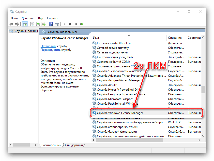 В менеджере служб Windows 10 найдите пункт «Служба Windows License Manager» и дважды кликните по нему левой кнопкой мышки.