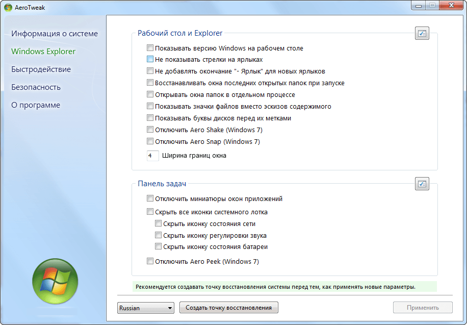 дим интерфейс программы. В левой части выбираем пункт «Windows Explorer» а справа находим пункт «Не показывать стрелки на ярлыках» и отмечаем его галочкой.