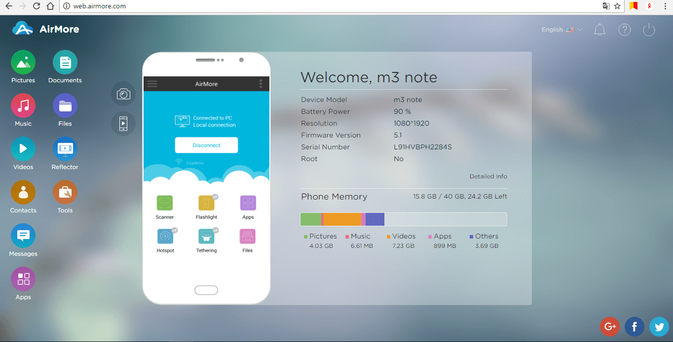 Для того, чтоб осуществить удаленное управление смартфоном, необходимо выполнить ряд простых действий. Для начала, нужно скачать программу AirMore на персональный компьютер. Далее, отсканировав смартфоном QR-код, найти ее в Google Play Market, и установить на мобильное устройство.