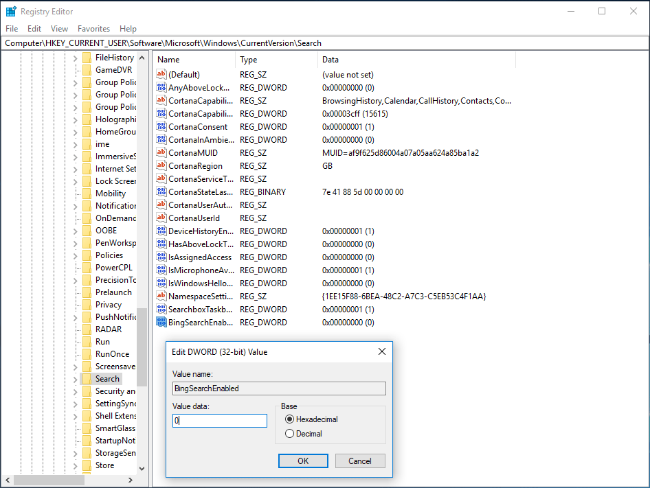 Шаг 5: дважды щелкните CortanaConsent и также установите для него значение 0.
