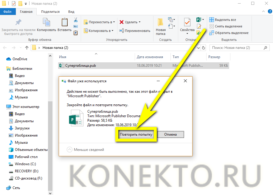 Внимательно прочитать в диалоговом окне, что именно служит причиной ошибки. В приведённом примере файл не удаляется, потому что открыт в программе-редакторе; следовательно, чтобы удалить его, нужно закрыть прогу.