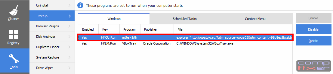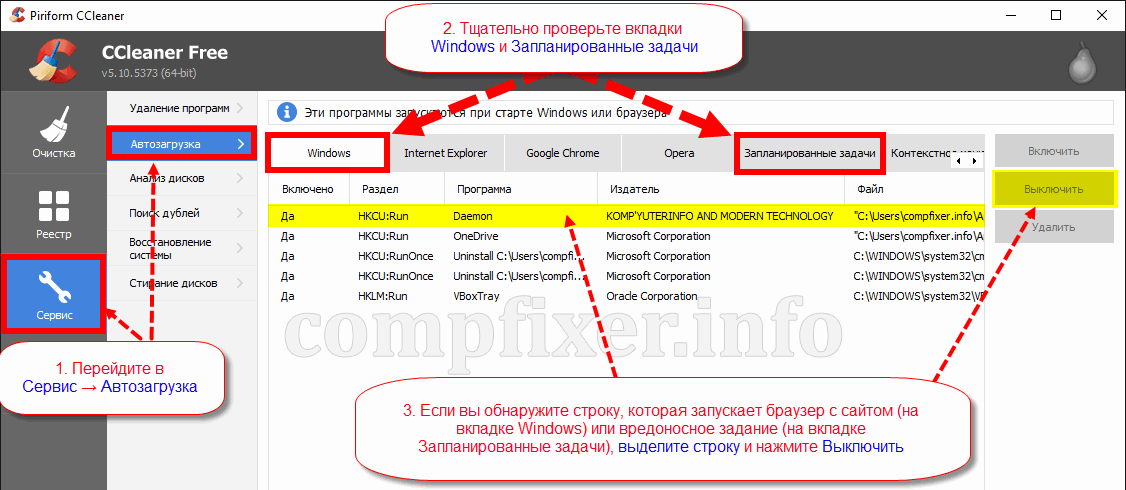 Утилиты от сторонних разработчиков позволяют убрать Яндекс браузер из автозагрузки. На примере CCleaner рассмотрим, как это работает: