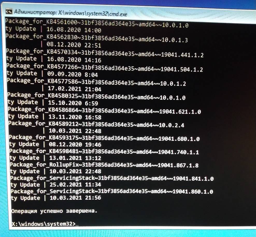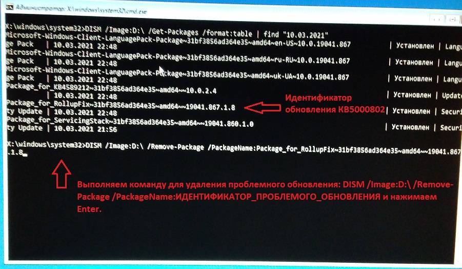 *В моем случае, данная команда, позволяет удалить обновление КВ5000802 на ОС Windows 10 версии 2004 и 20H2. У вас, все может быть иначе. Не копируйте бездумно команду выше. Замените/перепроверьте идентификатор проблемного пакета.