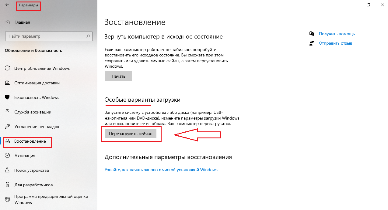 Выбираем вариант Особые варианты загрузки и нажимаем Перезагрузить сейчас»:
