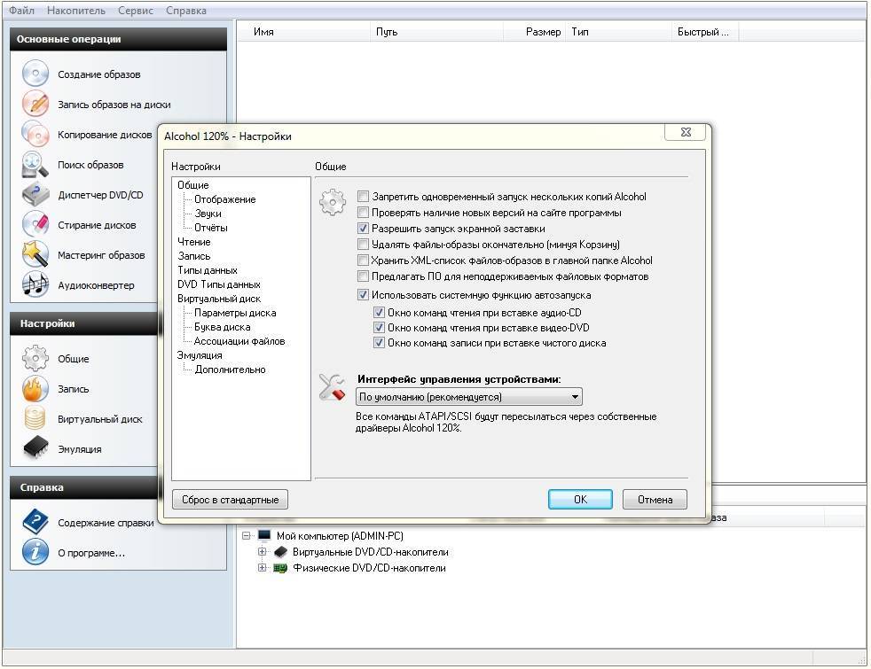 - В программе Alcohol 120% открываем вкладку «Сервис», выбираем «Настройки», далее переходим в пункт «Виртуальный диск», ставим количество приводов в значение 0 и сохраняем изменения кнопкой OK. Находим параметры виртуального привода и ставим фильтр «Число виртуальных дисков» в значение 0
