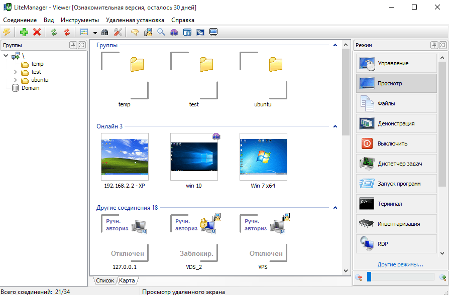 Примечание . В бесплатной версии имеется ряд ограничений: максимальное количество удаленных клиентов – 30 штук, и несколько урезанный функционал (впрочем, не существенно).