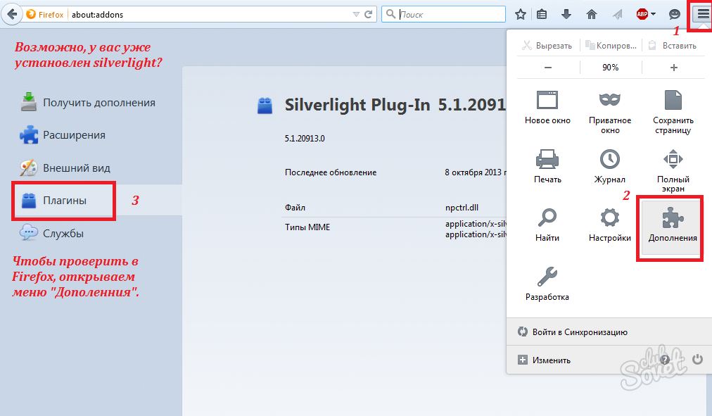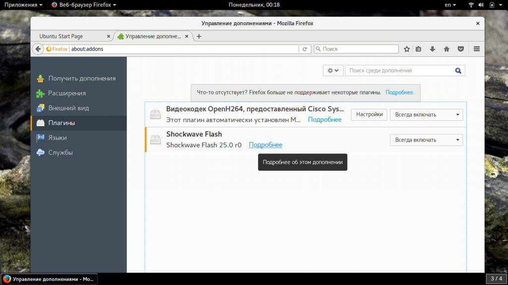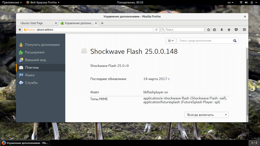 Затем, чтобы убедиться, что установка прошла успешно, откройте браузер, например, Firefox, выберите “Дополнения”, затем “Плагины”. Здесь вы можете видеть, что флеш плеер уже установлен, причем самой последней версии – 25: