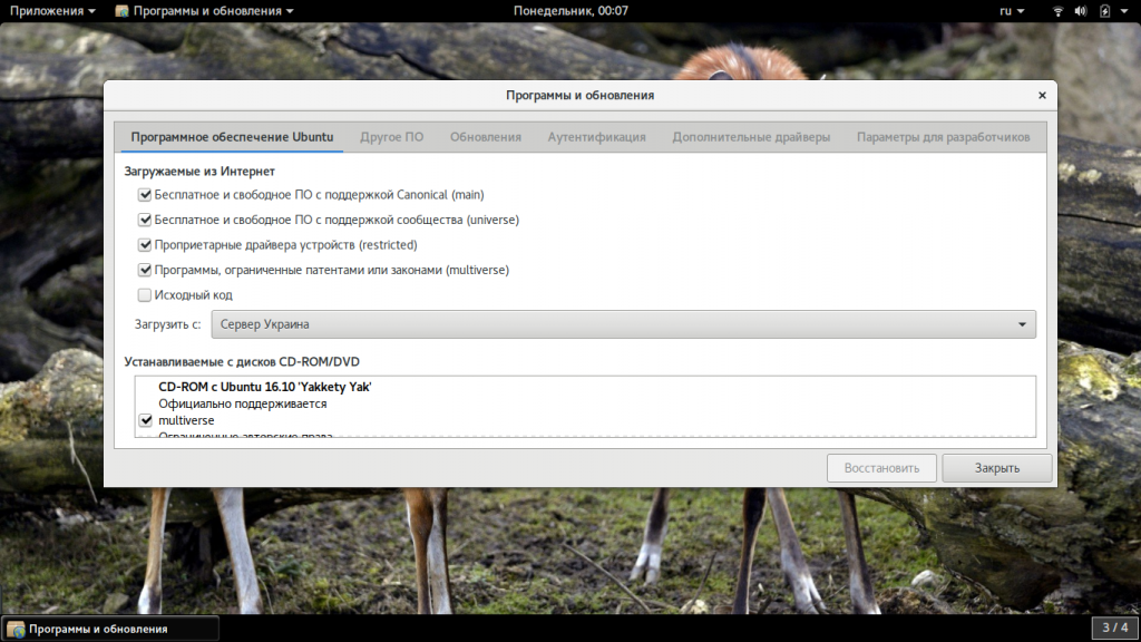Затем отметьте флажки напротив репозиториев Universe и Multiverse: