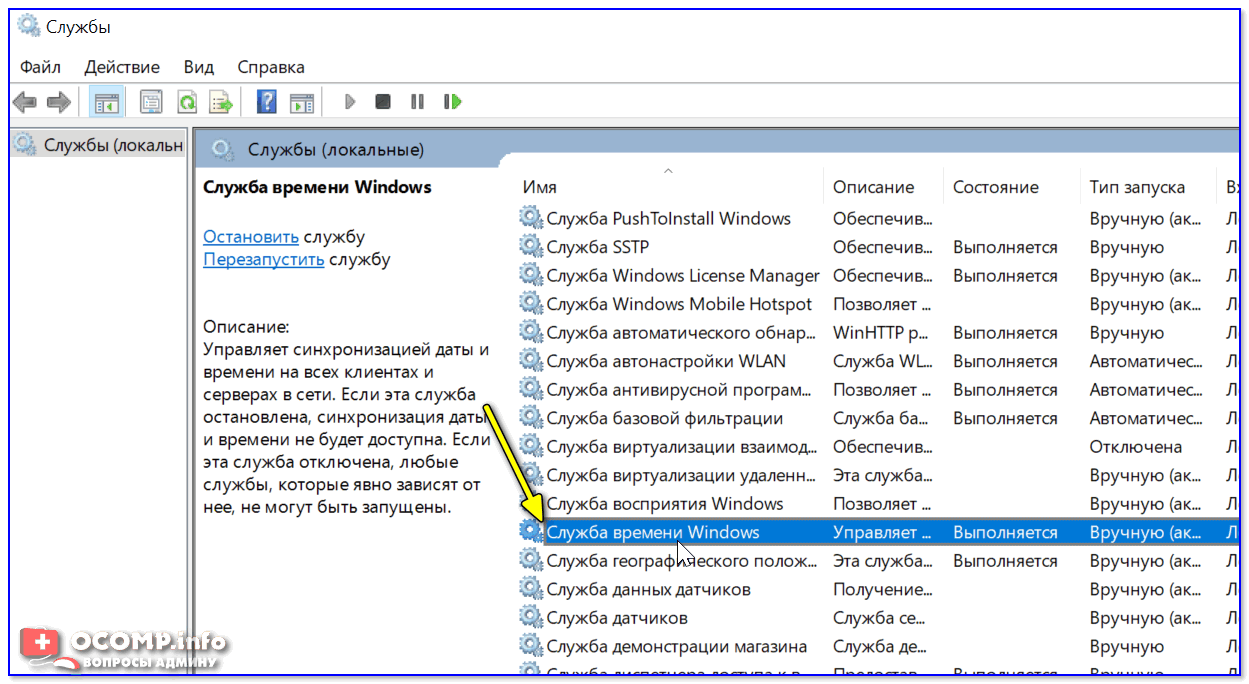 В списке служб нужно найти «Службу времени Windows» и открыть ее.