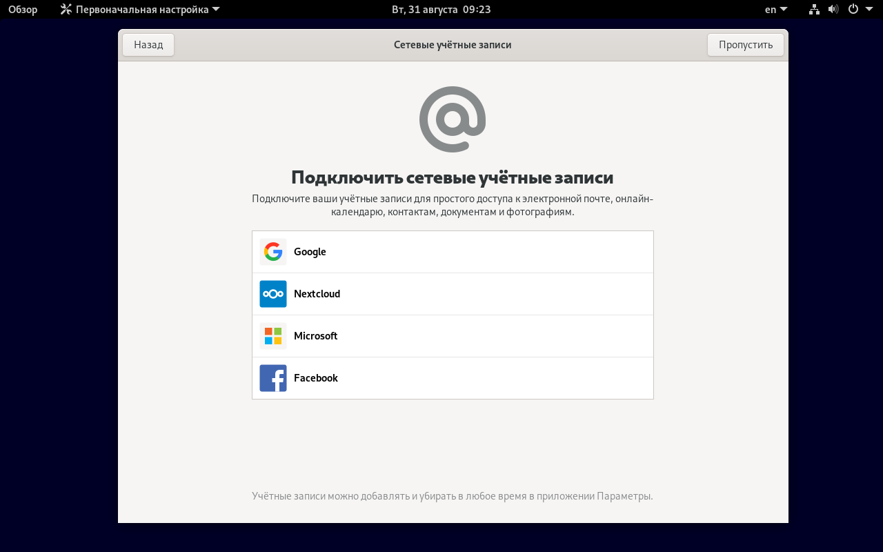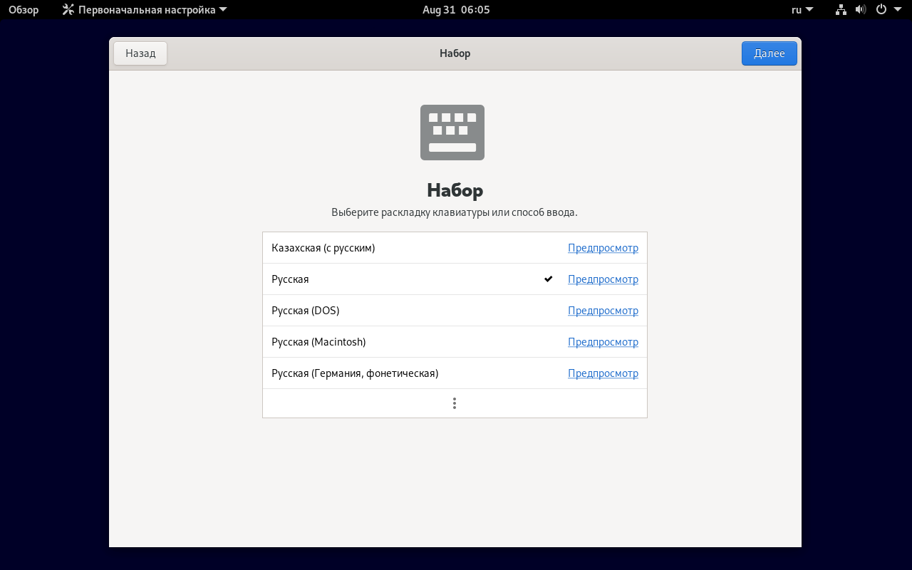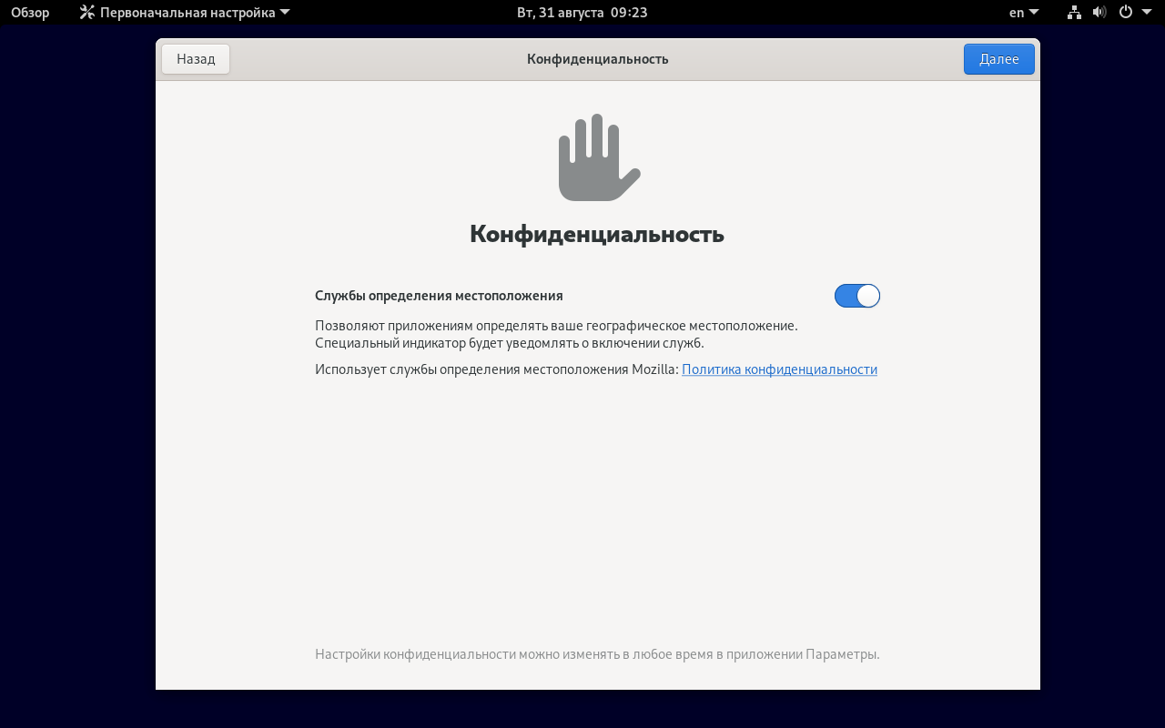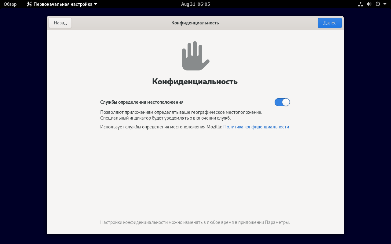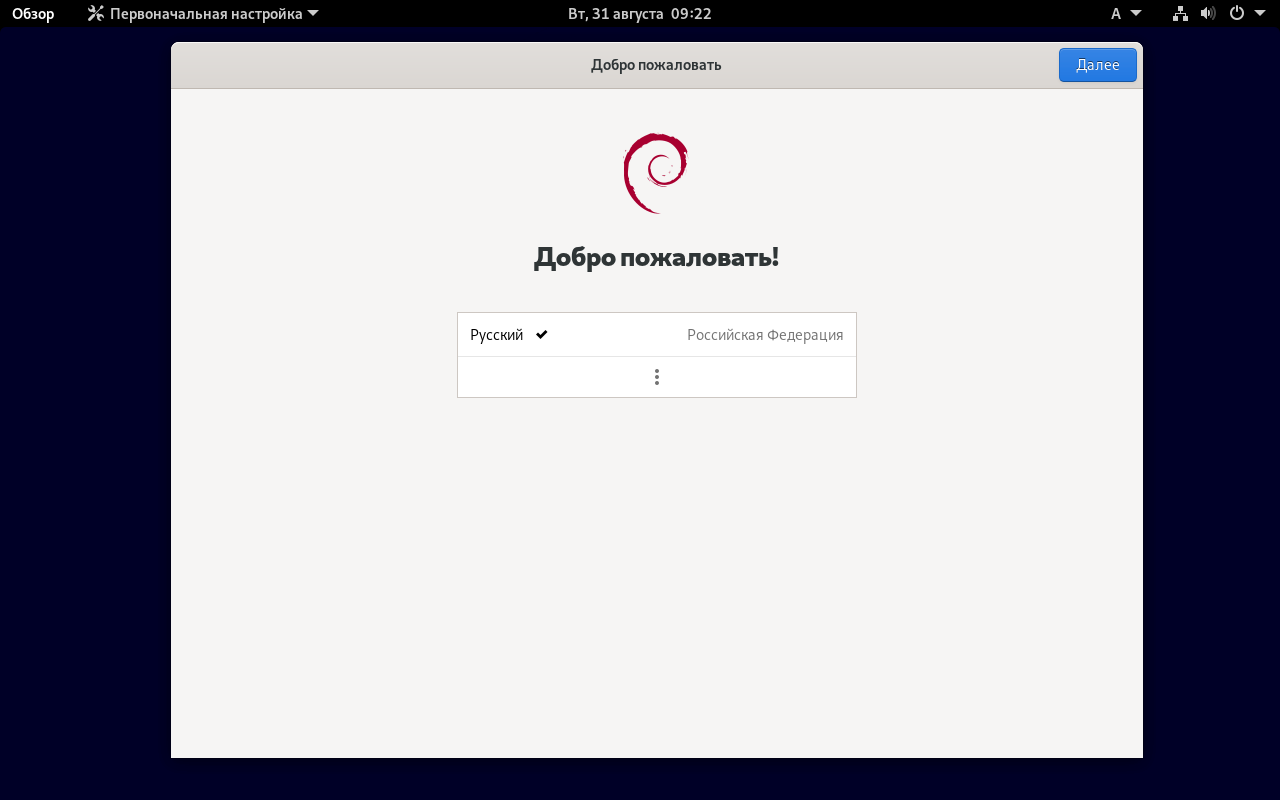 Первоначальная настройка открывается лишь при первом запуске системы, а в случае с Live-образом, это происходит постоянно, так как его состояние не сохраняется. Доступен только ранее выбранный русский язык, поэтому просто нажимаем Далее.