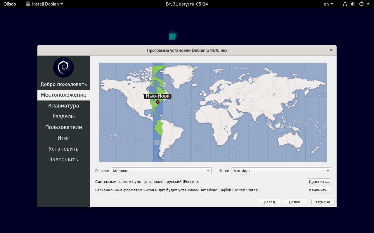 Часовой пояс проще всего выбрать на карте, время в верхней панели поменяется автоматически.