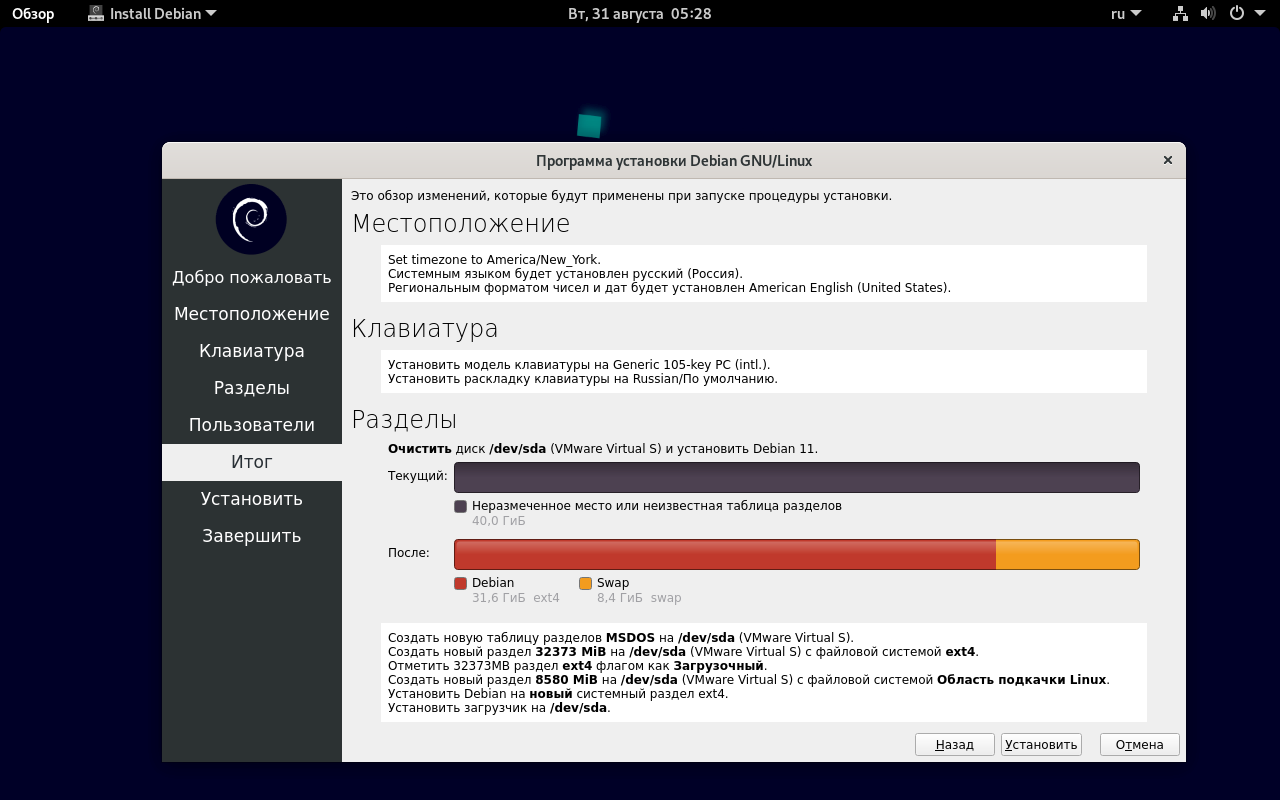 На следующем этапе пойдёт автоматическая установка Debian 11. К сожалению, посмотреть терминал нельзя, узнать подробности не получится.