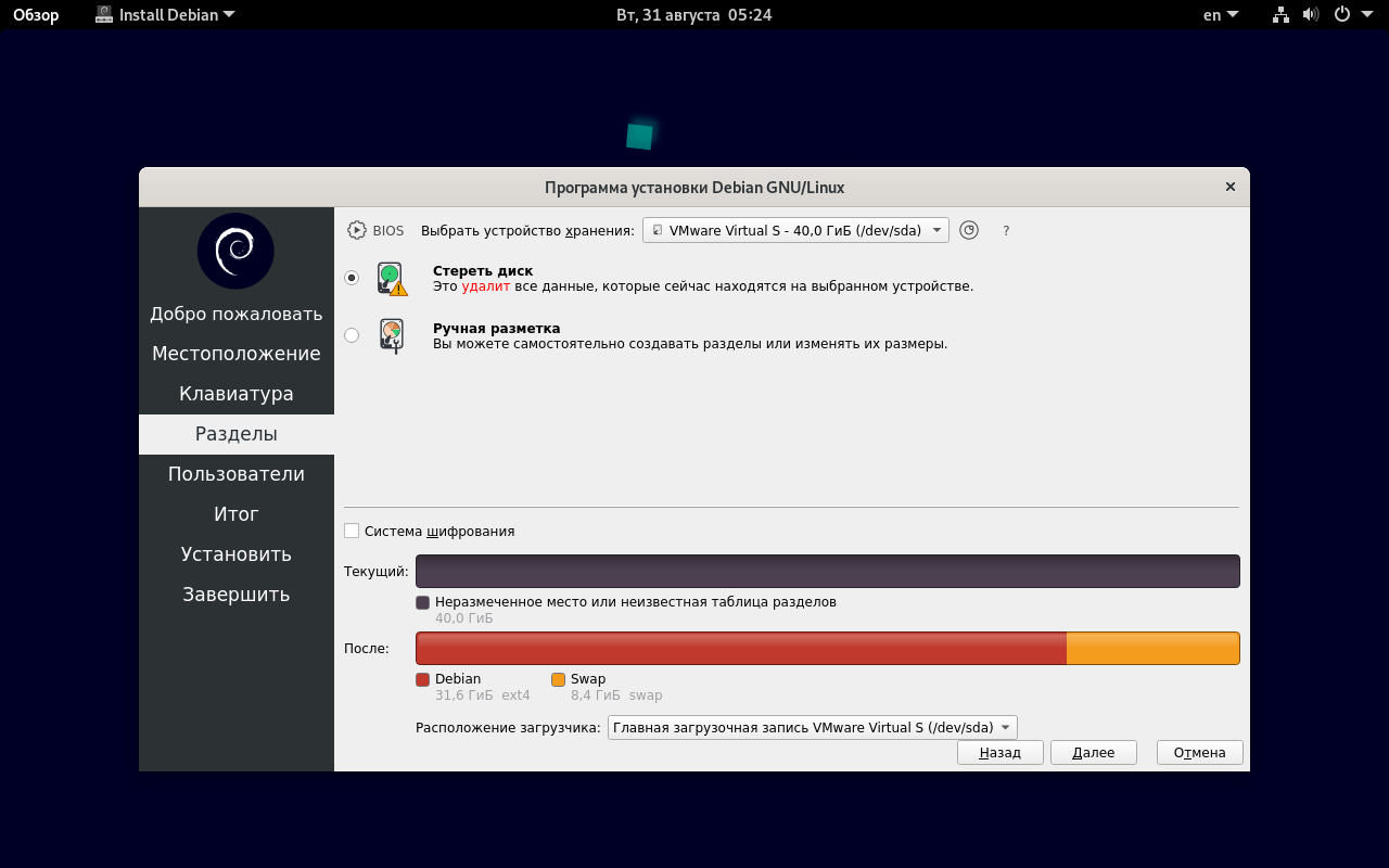 Если устанавливаете систему на компьютер без операционной системы, то просто выбирайте автоматический режим Стереть диск. В нижней части изображена разметка после установки. Calamares по умолчанию выделяет около 8 ГБ под файл подкачки, стандартный установщик в свою очередь всего 1 ГБ.