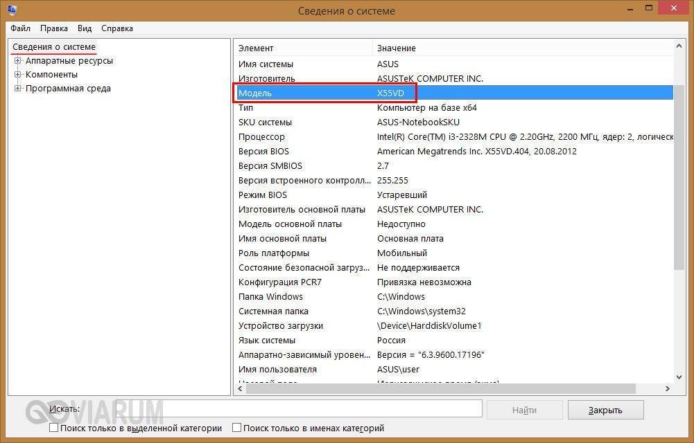Рассмотрим всё это дело на примере лэптопа фирмы Asus. Помимо названия бренда нужно знать модель ноутбука. Определить ее очень просто – искомое обозначение должно быть указано на нижней части корпуса, на наклейке. Также вы можете выполнить в окошке Run (Win+R) команду msinfo32 и посмотреть графу «Модель» в сведениях о системе. В нашем примере это ASUS X55VD.