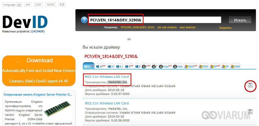 Далее зайдите на ресурс devid.info/ru, вставьте отредактированную строку в поле поиска и нажмите «Искать», указав в выпадающем меню свою версию ОС. Название производителя смотрим в результатах поисковой выдачи. Например, у нас это MediaTek (Ralink). С этого же ресурса вы можете скачать драйвер вай-фай для ноутбука с Windows 7/10 абсолютно бесплатно.