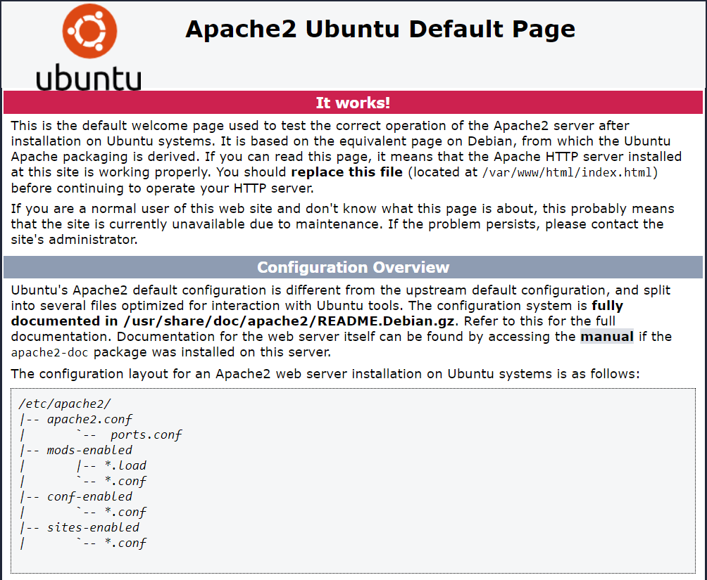 Вы должны увидеть страницу Apache2 Ubuntu default page, как показано на рисунке ниже.