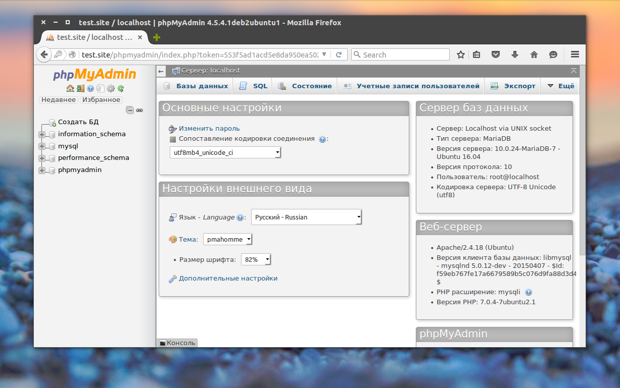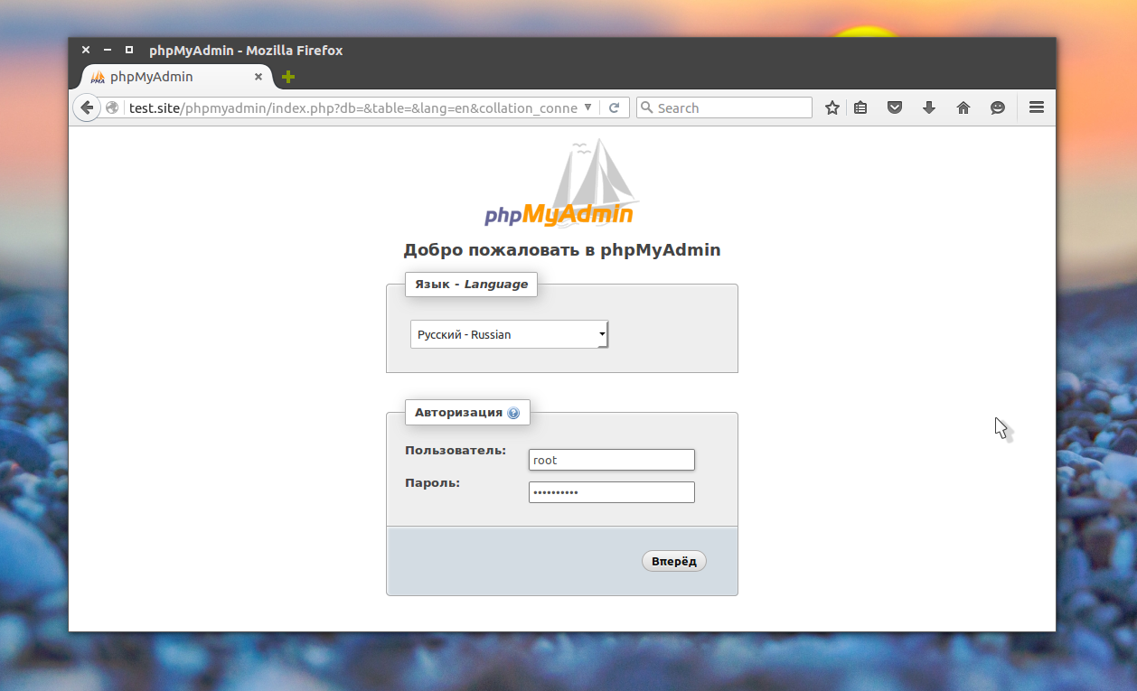 Когда установка Рhpmyadmin в Ubuntu 16.04 будет завершена, откройте браузер и наберите в адресной строке localhost/phpmyadmin: