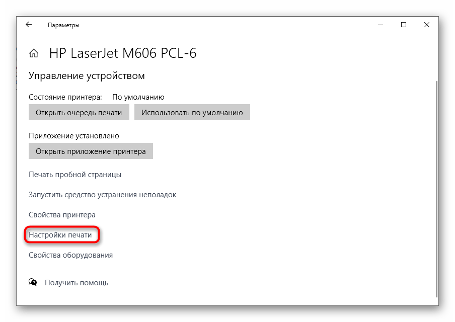 Раздел «Настройки печати» доступен для каждого принтера, но точные параметры напрямую зависят от разработчиков периферии. Для принтеров от HP характерно несколько стандартных настоек, о которых и пойдет речь далее.