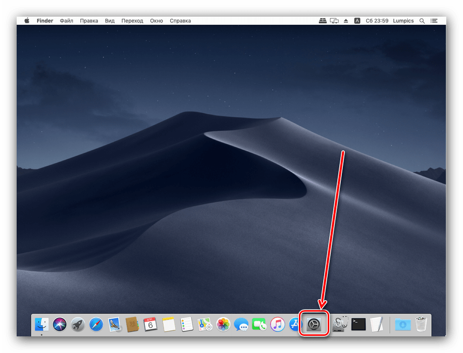 - Откройте «Системные настройки» любым удобным способом, например, посредством Dock.