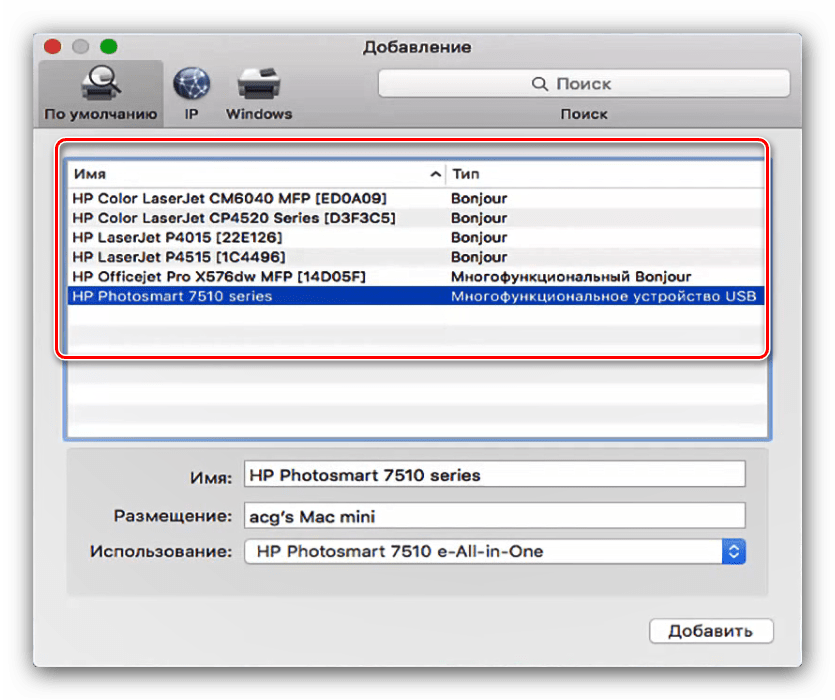 Далее воспользуйтесь выпадающим меню «Использ.». Если ПО подключаемого устройства уже установлено на МакБук, используйте пункт «Выбрать ПО». Если драйвера требуется установить, воспользуйтесь вариантом «Другой» – вам будет предложено самостоятельно выбрать инсталлятор. Если драйвера отсутствуют на MacBook, и установочного файла нет, используйте пункт «Общий принтер PostScript» или «Общий принтер PCL» (только для принтеров HP). Нажмите на кнопку «Добавить».