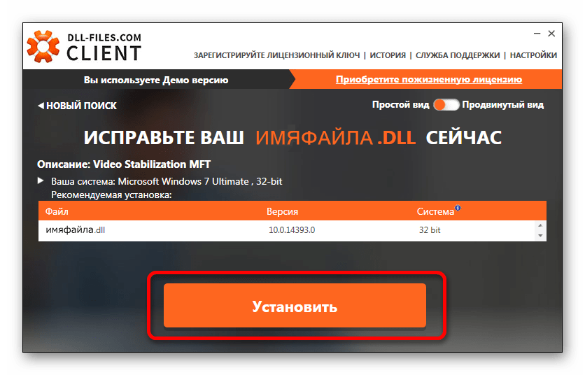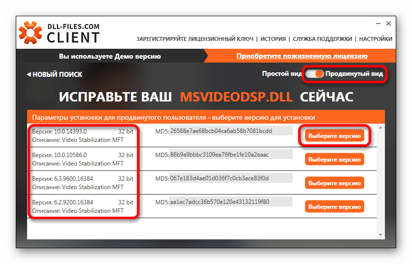У программы имеется дополнительный продвинутый вид – это режим, в котором вы сможете выбрать различные версии DLL для установки. Если игра или программа требует конкретную версию файла, то можно найти её, включив этот вид в DLL-Files.com Client.