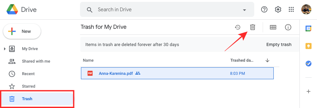 Когда файлы были перемещены в корзину, вы можете удалить их навсегда, используя опцию «Корзина» в разделе «Корзина» на Google Диске.