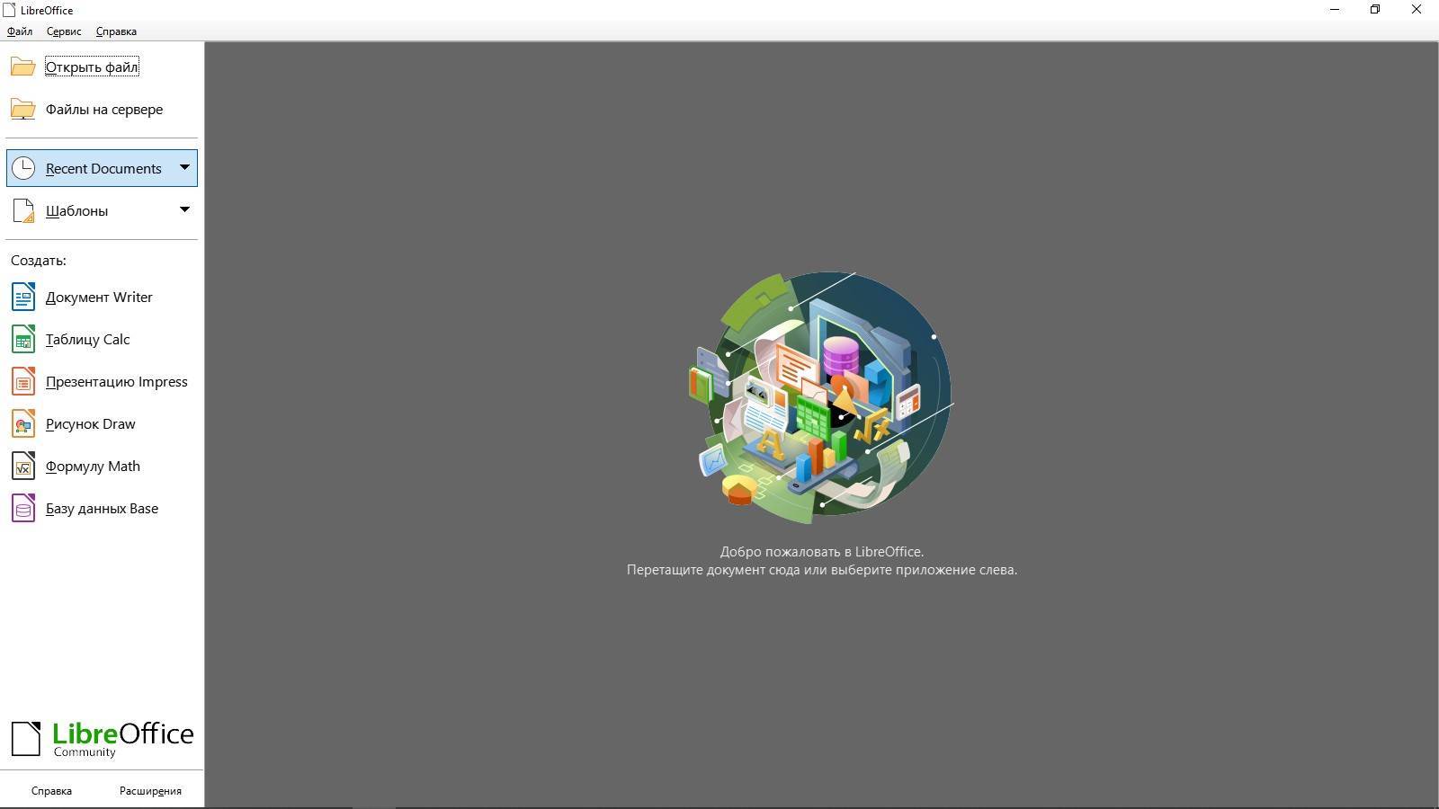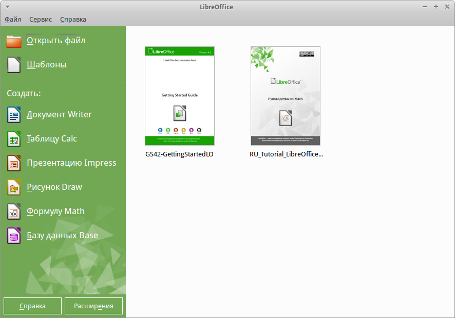 При нажатии на пункт меню LibreOffice открывается стартовый экран LibreOffice, в котором можно выбрать любой компонент LibreOffice. Также можно выбрать пункт Открыть файл или использовать Шаблоны.