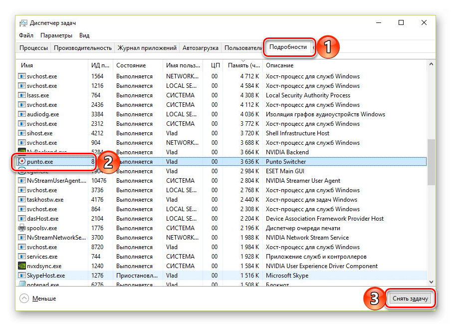 Если Вы можете найти иконку программы «Punto Switcher», то запустите диспетчер задач (одновременное нажатие клавиш Ctrl+Alt+Del или щелчок правой мышки на панели задач). В появившемся окне диспетчера задач откройте вкладку «Процессы», найдите процесс punto.exe или ps.exe, кликните по названию процесса правой кнопкой мыши и в появившемся меню выбирете пункт «Завершить процесс».