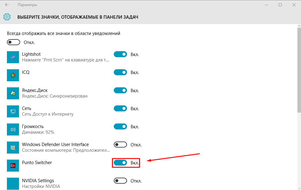 Переключаем бегунок на «Вкл». Теперь значок Punto Switcher всегда будет у нас на глазах.