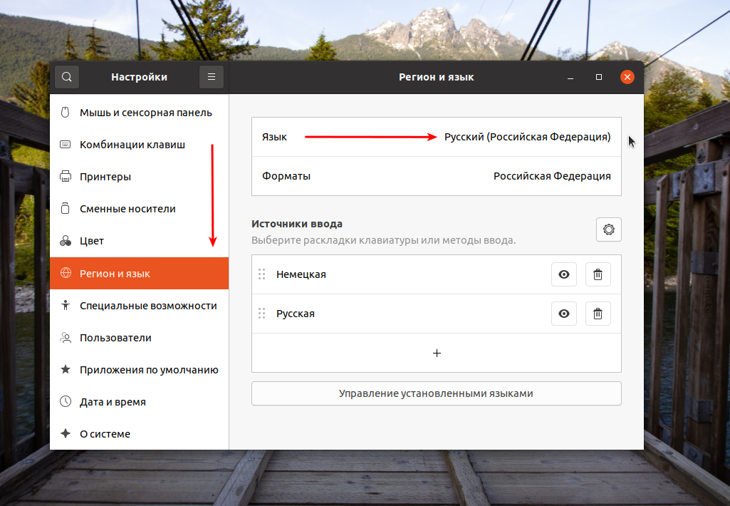 В появившемся окне настроек в его левой части надо колёсиком мыши прокрутить вниз и выбрать пункт Регион и язык (Region & Language). В правом верхнем углу будет указан текущий язык; если это Русский, то всё уже готово и окно настроек можно закрыть.
