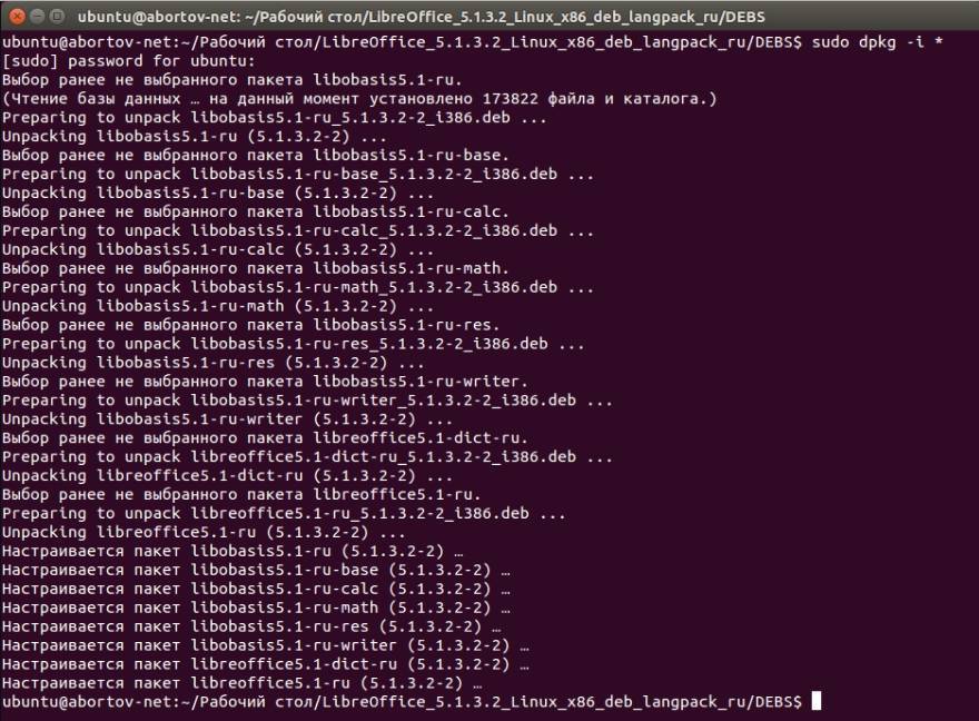 Здесь пакет libreoffice-l10n-ru отвечает за русификацию программного интерфейса, а пакет libreoffice-help-ru русифицирует справочную систему к программе. Для выполнения этой команды потребуется ввести пароль суперпользователя, а затем, если система запросит подтверждение, подтвердить установку командой д.