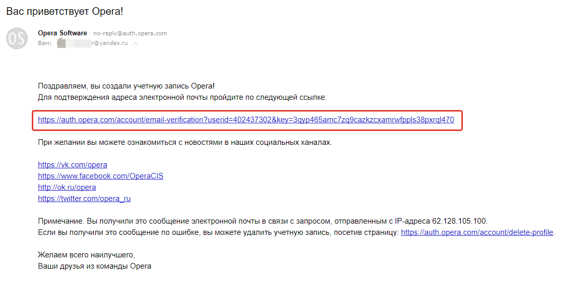 После включения синхронизации нужно ещё подтвердить свою электронную почту, на которую вы регистрировали учётную запись в Opera, поскольку если зарегистрированный аккаунт не подтверждён, то, скорее всего, его удалят через определённый промежуток времени. Для этого откройте свою почту и найдите там письмо от Opera. Скорее всего, будет называться “Вас приветствует Opera!”. В этом письме перейдите по активационной ссылке.
