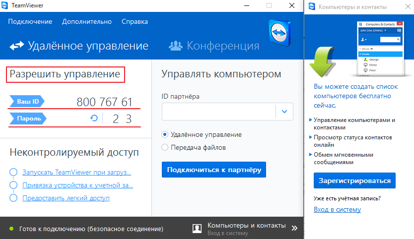 Для подключения к собственному ПК используется постоянный личный пароль, созданный при установке программы и ID компьютера. Чтобы получить доступ к устройству, компьютер следует оставить включенным и, находясь вне дома, связаться с ним с мобильного устройства или любого другого ПК, запустив TeamViewer и указав данные для идентификации. Другое решение, которое предоставляет TeamViewer – запуск удаленного компьютера через Wake-on-LAN. Это позволяет пробудить отключенный от Сети ПК для дальнейшего удаленного им управления. Wake-on-LAN работает через другой ПК, подключенный к интернету или через публичный адрес устройства.