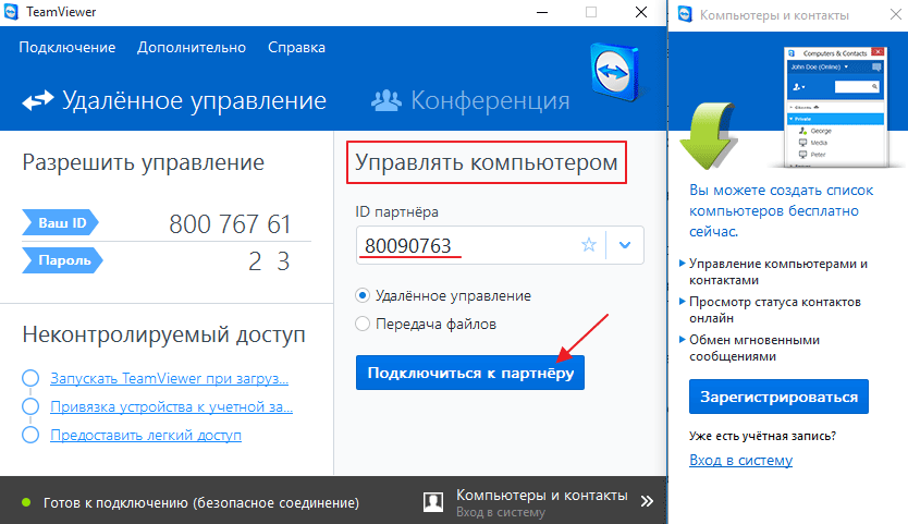 В первом случае необходимо, чтобы собеседник находился рядом с ПК, к которому выполняется подключение и смог запустить утилиту, а затем сообщить ID удаленного устройства и временный пароль, генерируемый программой. Эти данные видны при запуске утилиты.
