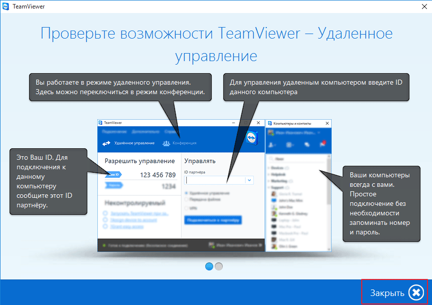 Начнется процесс установки, программа TeamViwer устанавливается довольно-таки быстро, после чего она автоматически запустится и появится небольшая инструкция о назначении тех или иных кнопок либо разделов, после ознакомления с некоторыми параметрами жмите «Закрыть»