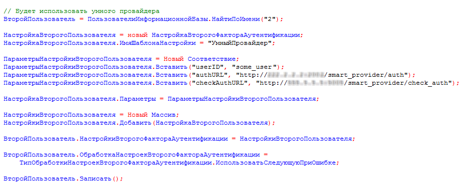 Обратите внимание, что каждому пользователю можно задать не один «набор» настроек, а несколько (массив). Свойство ОбработкаНастроекВторогоФактораАутентификации позволяет применять их по очереди в том случае, если исполнение текущего HTTP-запроса закончилось ошибкой
