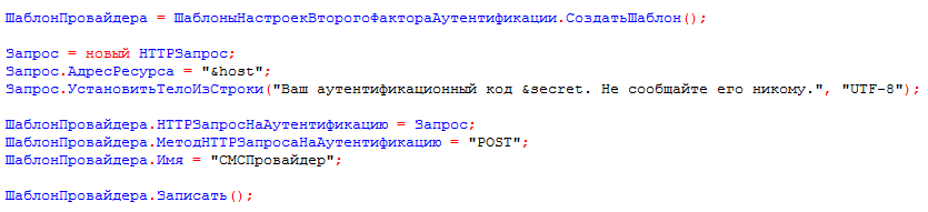 Чтобы описать HTTP-запросы, которые следует отправить провайдеру, мы реализовали во встроенном языке новый тип – ШаблонНастройкиВторогоФактораАутентификации. Объекты этого типа – это именованные объекты, которые вы можете сохранять в базе данных. Каждый такой шаблон позволяет сохранить сразу два HTTP-запроса: один для запроса аутентификации, другой – для получения её результата. Оба этих запроса описываются с помощью привычных объектов HTTPЗапрос, но имеют две интересные особенности: