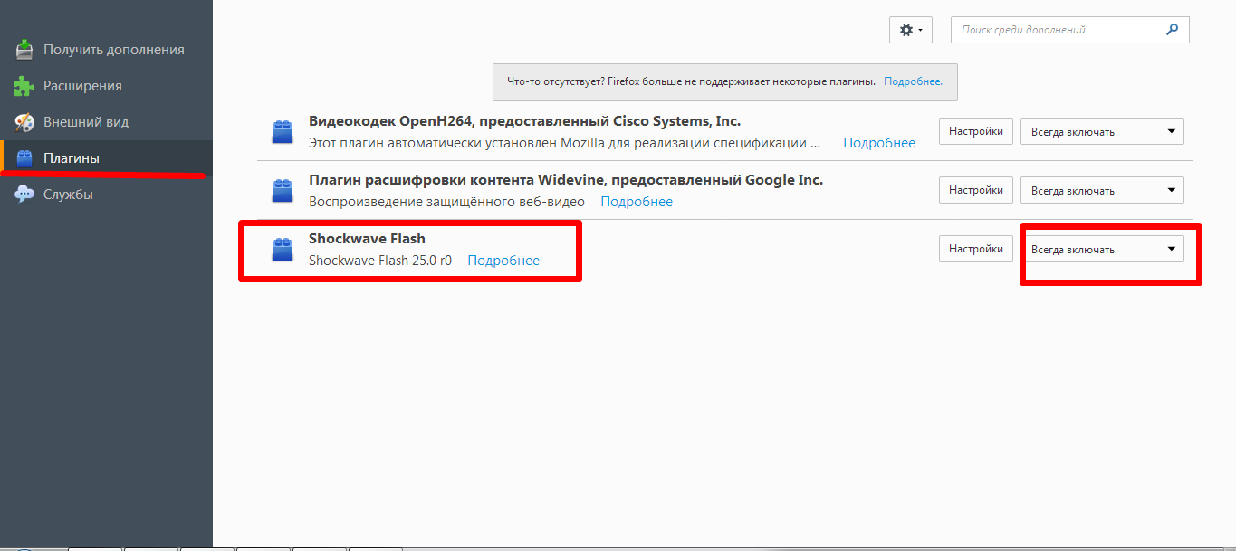 Вы откроете отдельную страницу, где необходимо выбрать вкладку «Плагинов» из левостороннего меню. Вам нужен плагин Shockwave Player (это альтернативное название проигрывателя Adobe). Если он отключен, активируйте его, изменив настройки. А если флеш плеер включен, но все равно не работает, разрешите ему всегда подключаться.