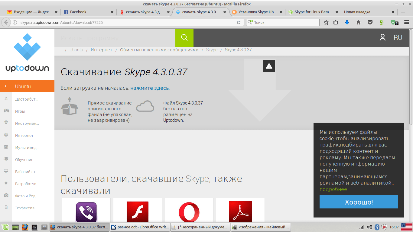 Также возможна установка с сайта, например из раздела «Скайп» сайта Uptodown по адресу: http://skype.ru.uptodown.com/ubuntu/download/77225 (рис. 15).