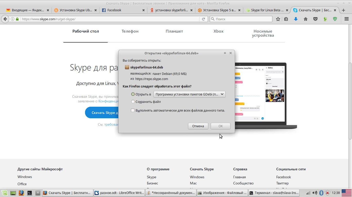Введите следующую команду для загрузки пакета Skype через gdebi: