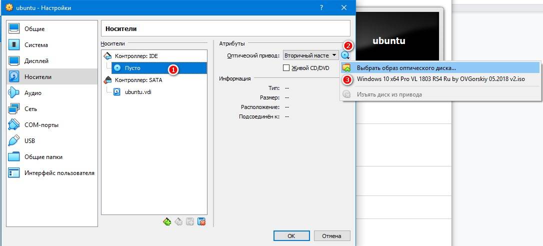 Затем на вкладке носители выбираем пустой диск, а в привод сандалим наш скачанный iso образ ubuntu.