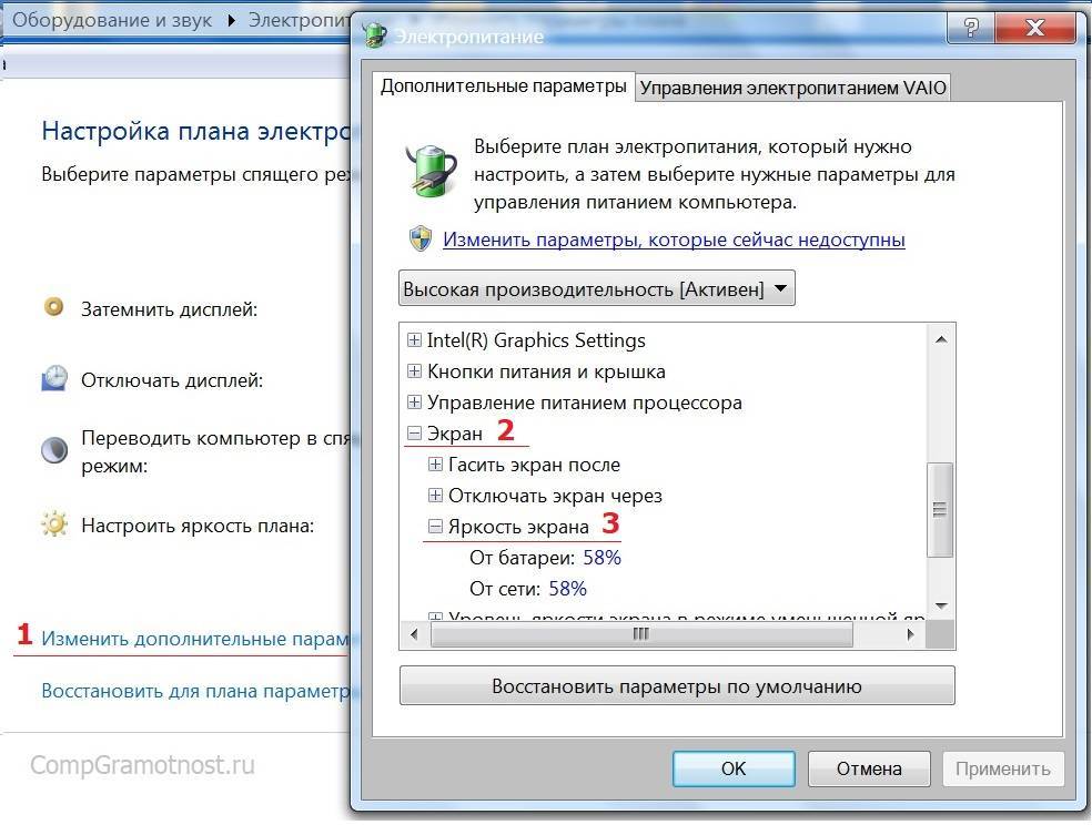 3 на рис. 2 — открываем «Яркость экрана», нажав на плюсик. Если кликнуть по одной из цифр 58% (а у Вас, конечно, могут быть иные цифры), то их можно редактировать и задавать другие, более удобные и подходящие Вам.