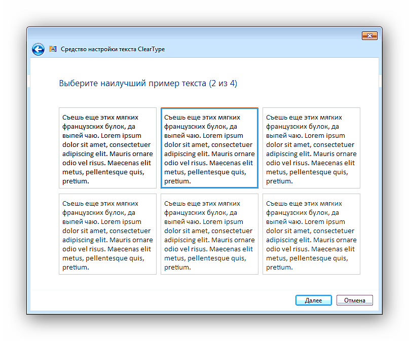 Здесь ваша задача ‒ найти наиболее четкий и приятный глазу образец текста. На этом калибровка экрана завершена.