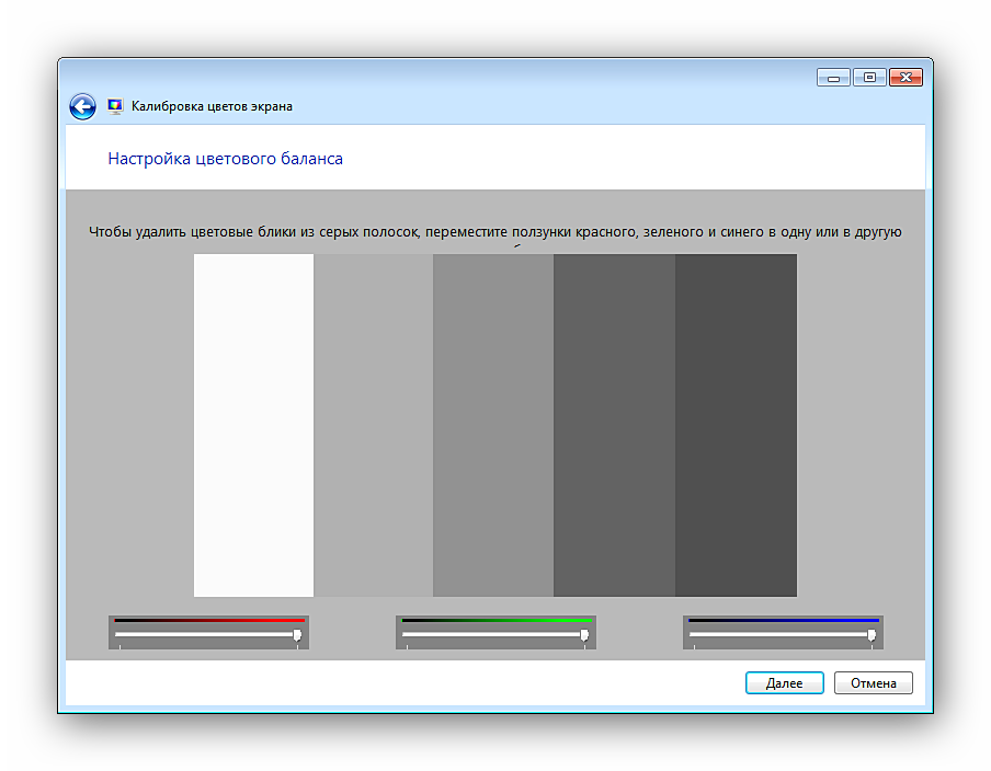 - После краткой вводной информации о принципах настройки экрана нажимаем несколько раз «Далее» и переходим к первому этапу «Настройка гаммы».