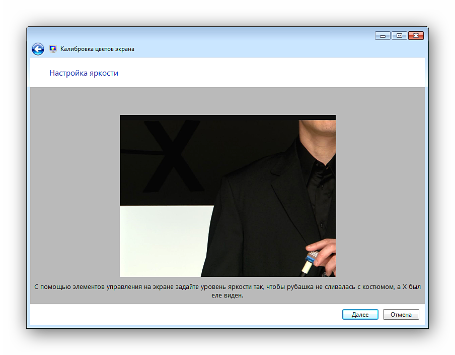 Ползунка подстройки нет, зато есть мужчина в черном пиджаке и литера X на фоне в качестве ориентира для поиска баланса. Регулировать яркость можно одним из вышеописанных методов.